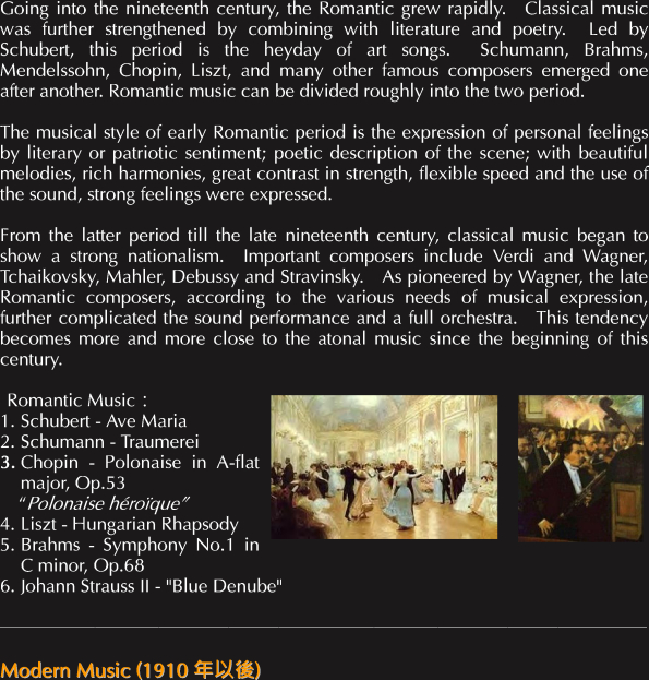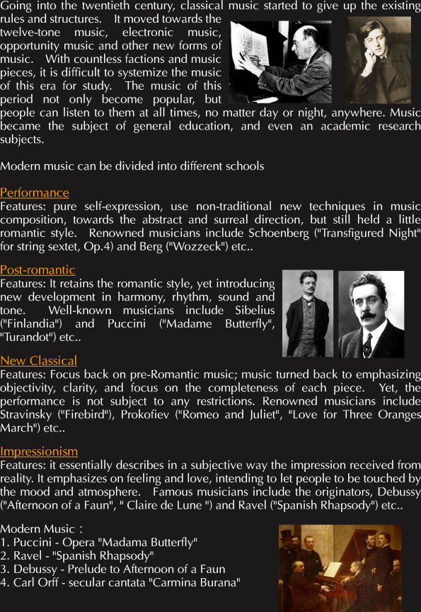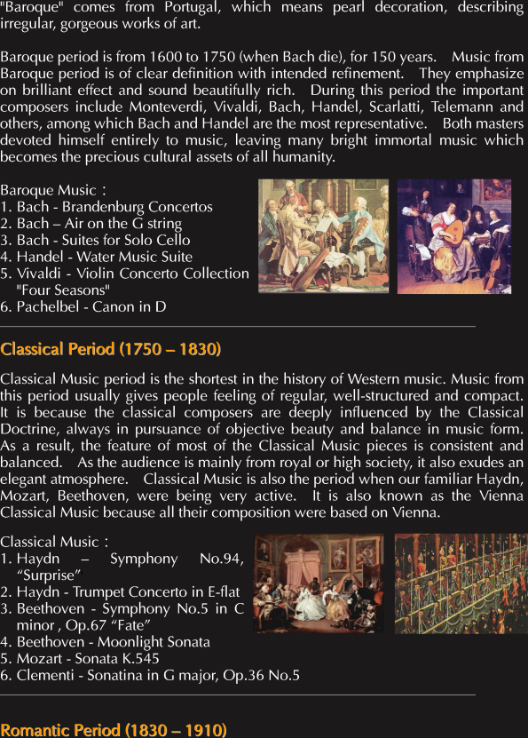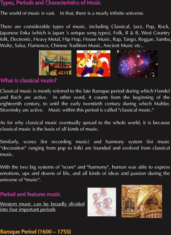 Keywords: types , periods , characteristics of music , classical period , baroque period , romantic period , modern music