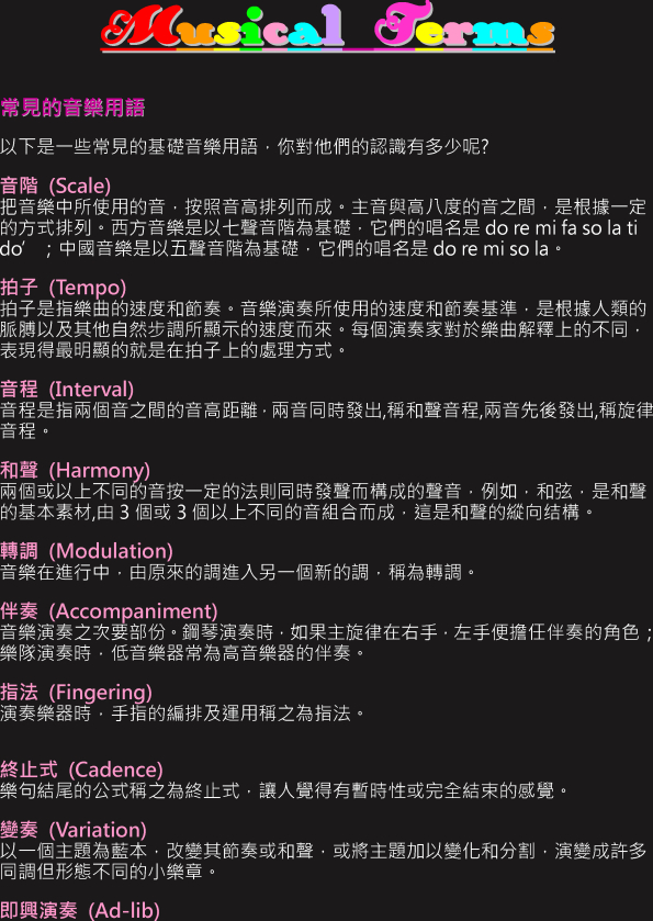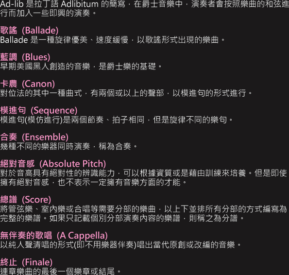 關鍵字: 音樂用語 , 音階 , 拍子 , 音程 , 和聲 , 轉調 , 伴奏 , 指法 , 終止式 , 變奏 , 即興 , 歌調 , 藍調 , 卡農 , 模進 , 合奏 , 無伴奏歌唱