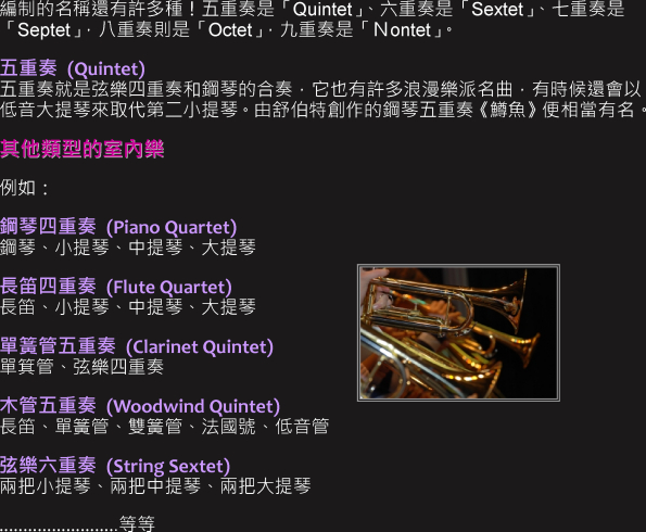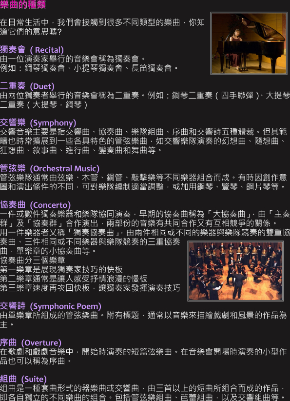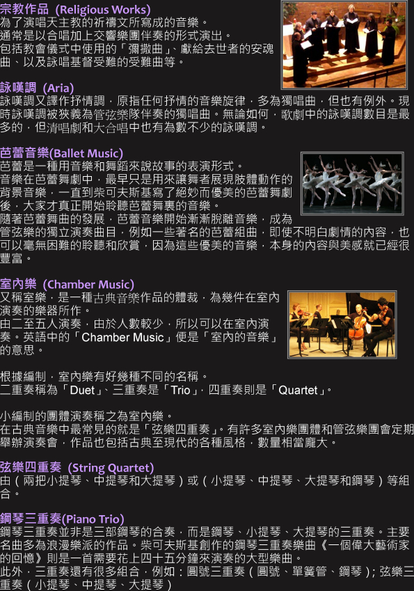 關鍵字: 樂曲種類 , 獨奏 , 二重奏 , 交響樂 , 管弦樂 , 協奏曲 , 交響詩 , 序曲 , 組曲 , 宗教作品 , 詠嘆調 , 芭蕾音樂 , 室內樂 , 弦樂四重奏 , 鋼琴三重奏 , 五重奏