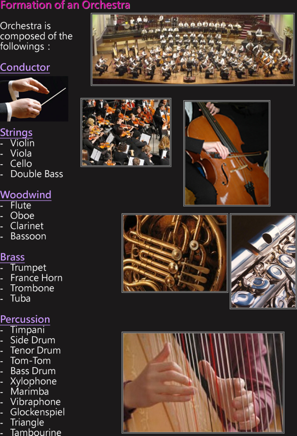 Keywords: Orchestra formation , conductor , strings , woodwind , brass , percussion , auxiliary instruments
